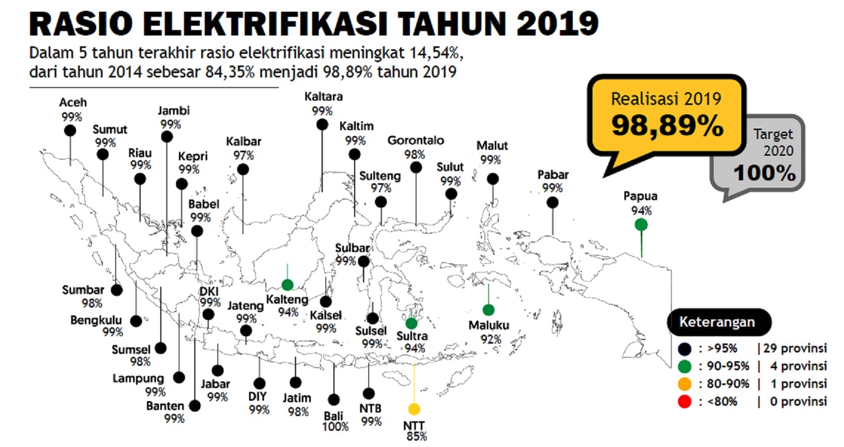 Hingga akhir tahun 2019, Kementerian ESDM mencatat rasio elektrifikasi nasional mencapai 98,89 persen. Angka ini naik sekitar 0,59 persen dari bulan Desember 2018 yang tercatat 98,30 persen.