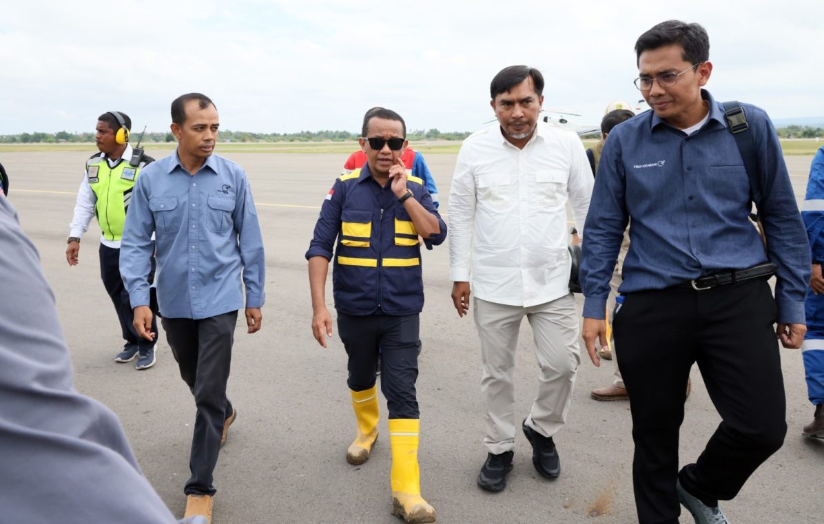 (kiri ke kanan): General Manager PT Medco E & P Malaka Tutu Paniji, Menteri ESDM Bahlil Lahadalia, Kepala BPMA Nasri Jalal, dan Senior VP Onshore Medco E&P Asset I Nyoman A. Sidi Mantra saat meninjau penyerahan bantuan logistik untuk warga terdampak banjir Aceh, yang diselenggarakan di Bandara Malikussaleh, Lhokseumawe, Selasa (2/12).