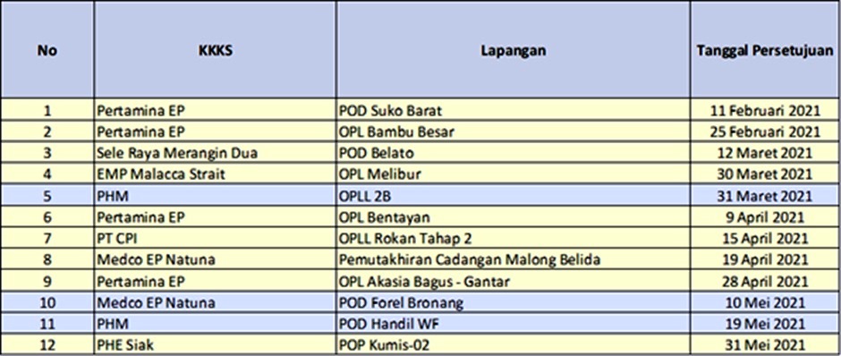 Evaluasi PoD yang tidak membutuhkan insentif diharapkan dapat diselesaikan pada September 2021. Sedangkan evaluasi PoD yang membutuhkan insentif dilakukan pembahasan secara paralel. Sebelumnya, Pemerintah telah menyetujui pemberian insentif untuk beberapa wilayah kerja, seperti PHM dan PHSS.