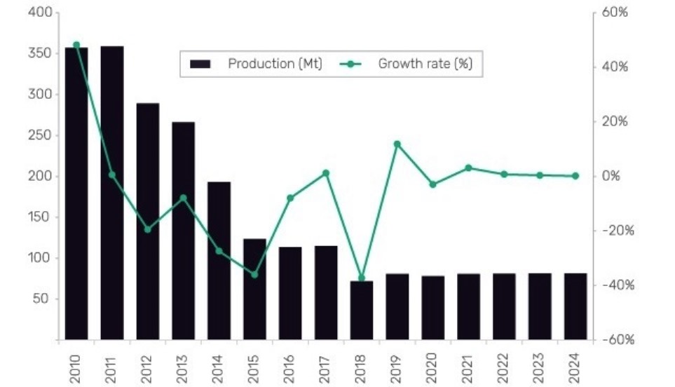 Produksi Biji Besi Cina (dalam juta ton/Mt) Periode 2010-2024. (Mining Intelegenci Center GlobalData)