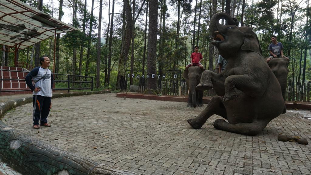 Gajah jantan bernama Luis Figo sedang berinteraksi dengan pengunjung. Gajah ini merupakan salah satu dari 4 gajah di Konservasi Gajah Aek Nauli, Sumatera Utara.