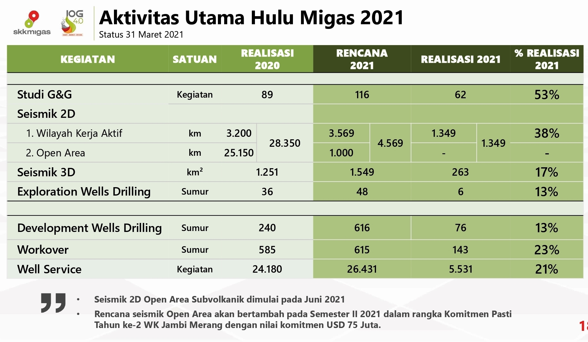 Realisasi kegiatan pada kuartal I-2021, survei seismik 2D telah mencapai 1,565 km; survei seismik 3D telah mencapai 265 km2, sedang pemboran Eksplorasi telah terealisasi 5 sumur.