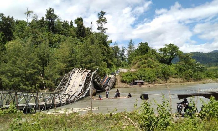Jembatan yang terbuat dari kayu sepanjang 40 meter tersebut putus saat truk pengangkut material tiang listrik melintasinya.