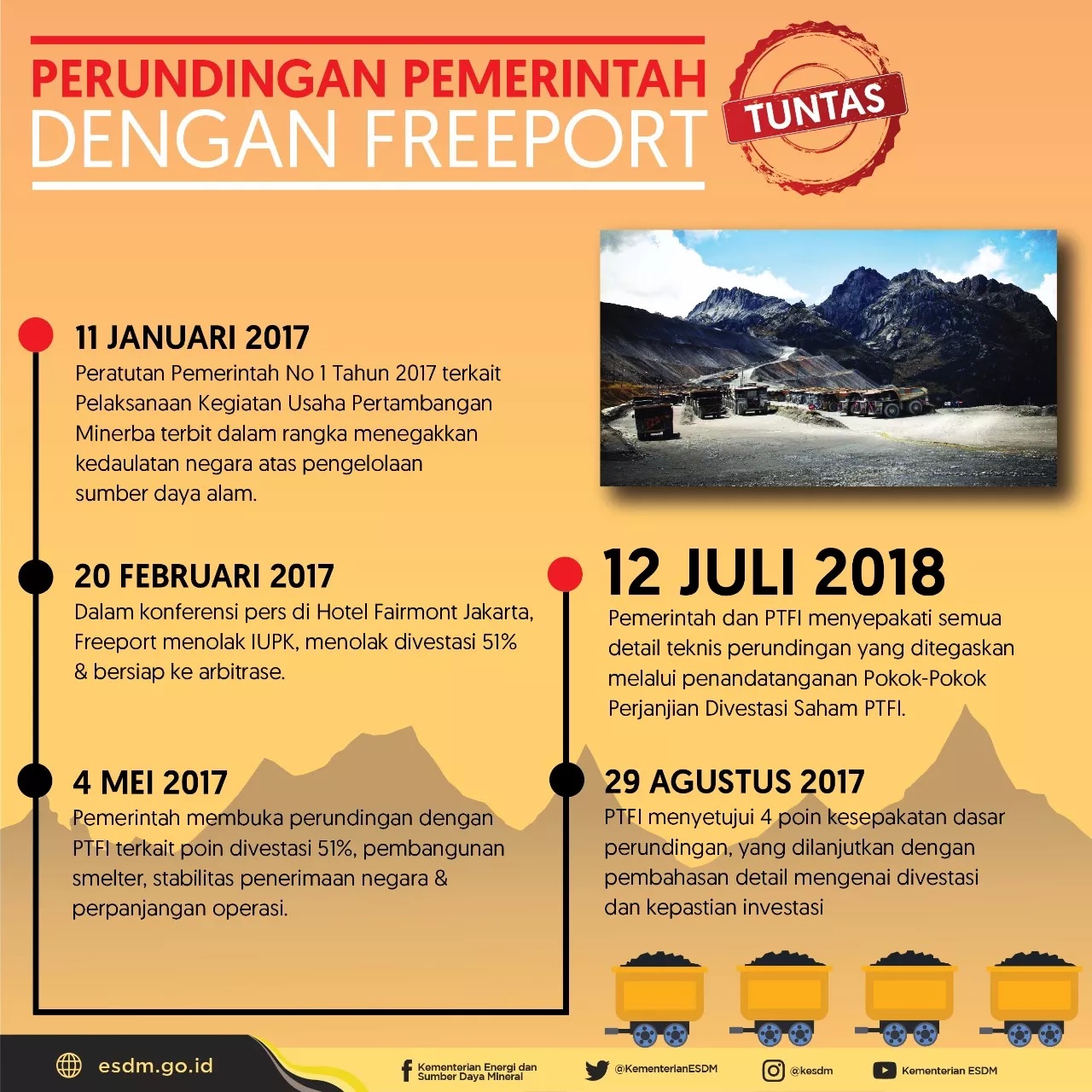 - 4 Mei 2017 – Pemerintah membuka perundingan dengan Freeport Indonesia terkait poin divestasi saham 51 persen, pembangunan smelter, stabilitas penerimaan Negara dan kelangsungan operasi Freeport di Indonesia.