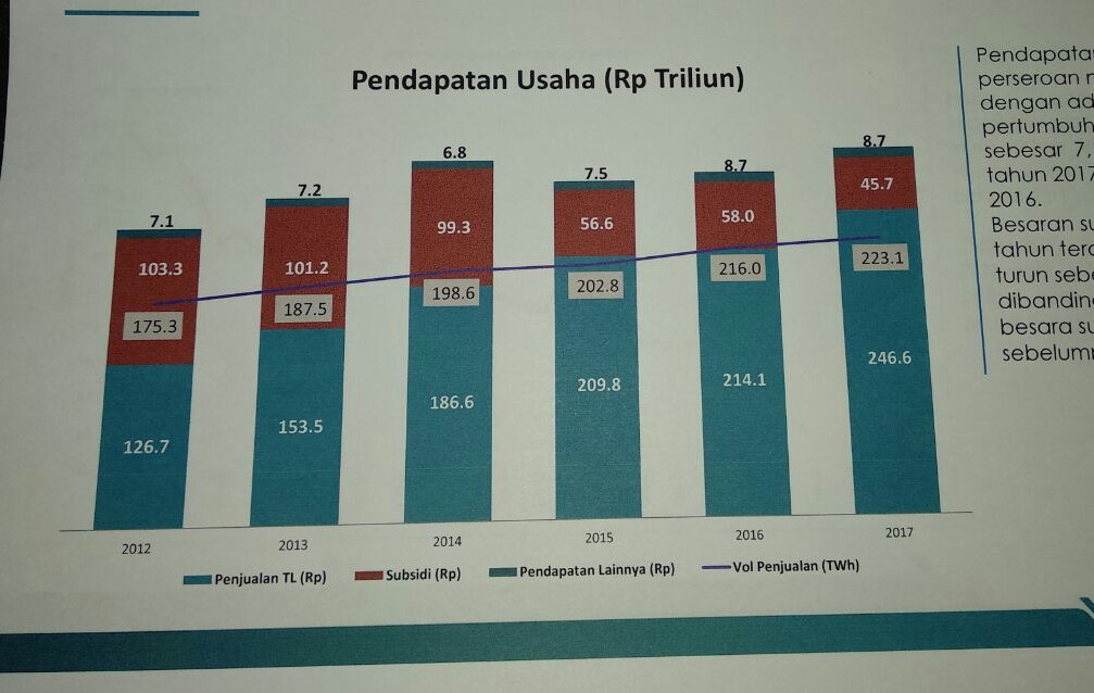 Sementara pendapatan usaha meningkat menjadi Rp 255,29 Triliun, atau naik 14,6 persen dari tahun sebelumnya. Pendapatan usaha meningkat seiring dengan adanya pertumbuhan penjualan sebesar 7,1 TWh selama tahun 2017 dibandingkan tahun 2016.