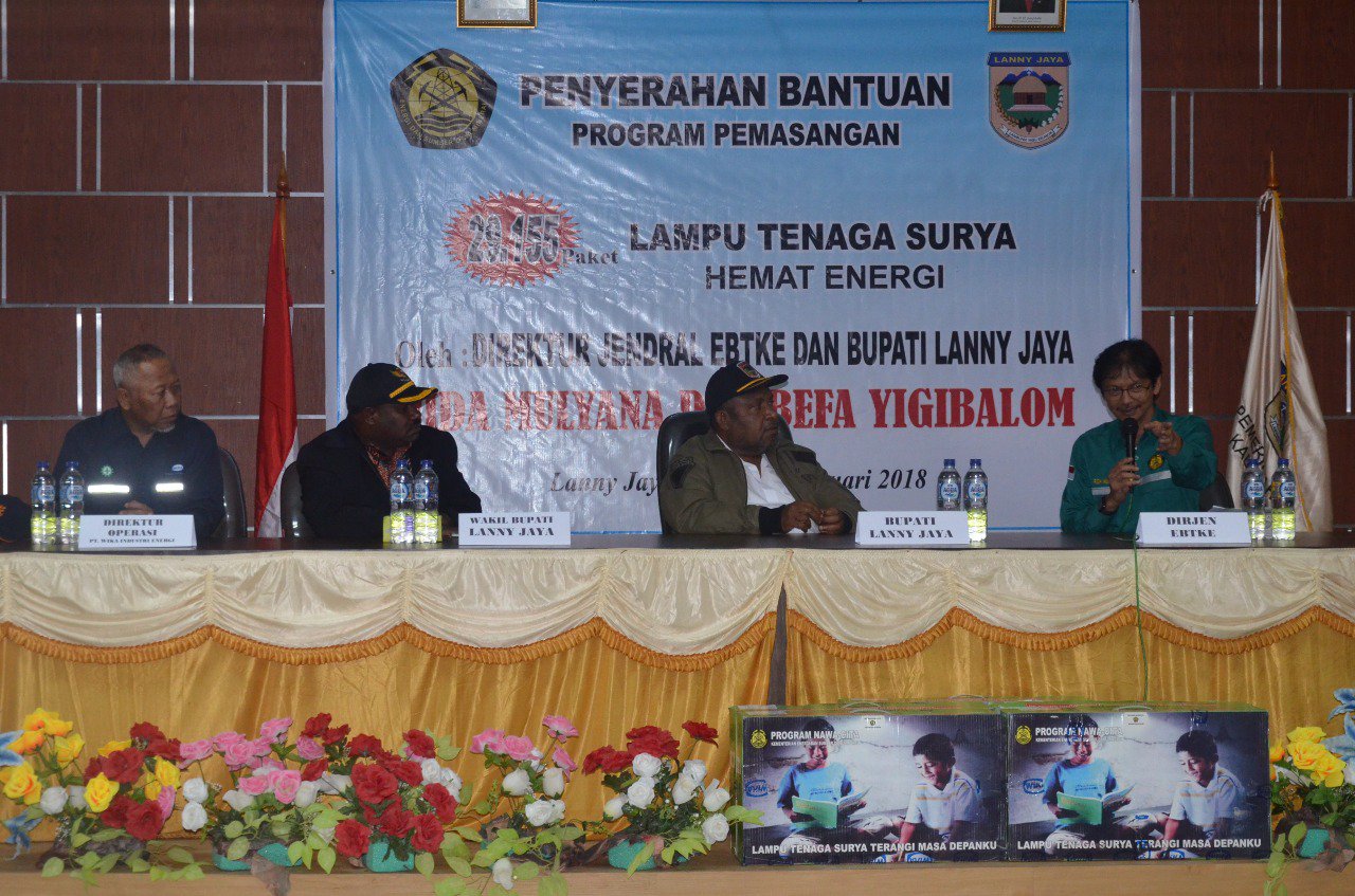 “Kami diminta untuk mengawal betul program nawacita ini untuk mewujudkan keadilan di seluruh rakyat Indonesia. Kami diserahkan tanggung jawab oleh Bapak Presiden untuk mewujudkan apa yang kami cetus sebagai energi berkeadilan,” ungkap Direktur Jenderal Energi Baru Terbarukan dan Konservasi Energi (EBTKE), Kementerian ESDM, Rida Mulyana, usai meninjau pemanfaatan LTSHE bagi warga Lanny Jaya, Rabu (14/2).