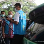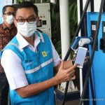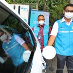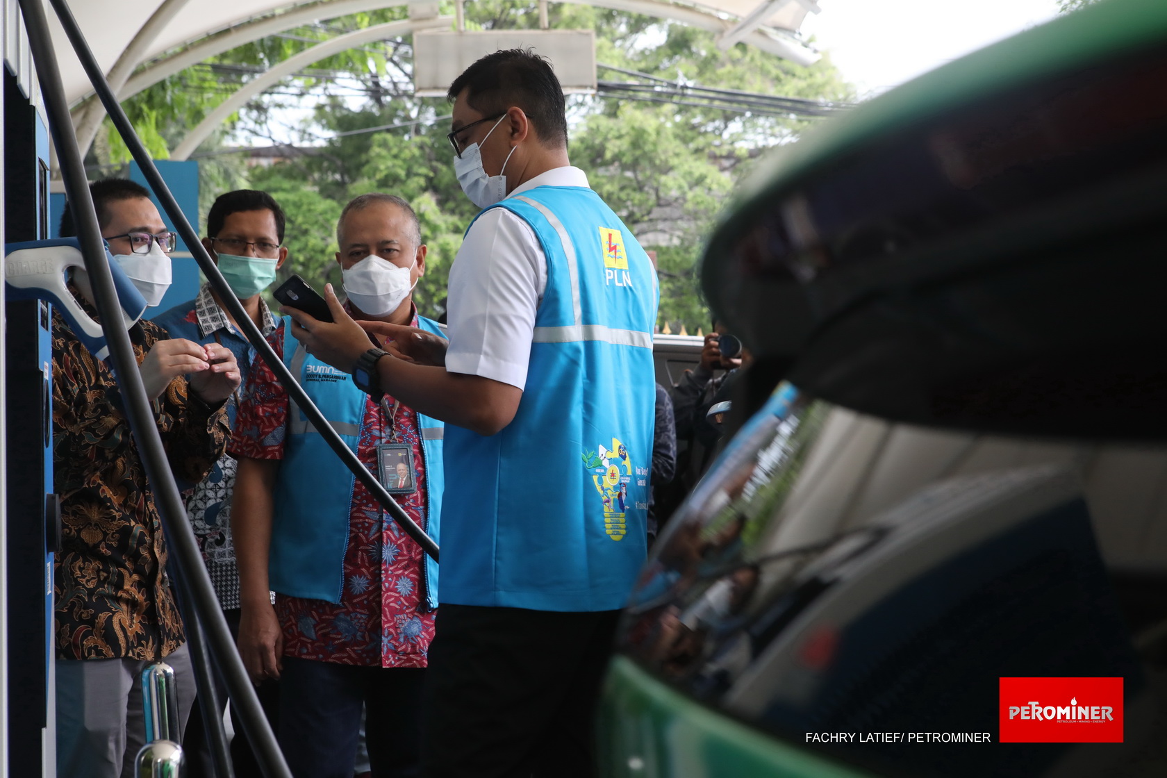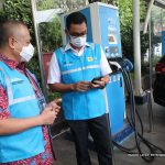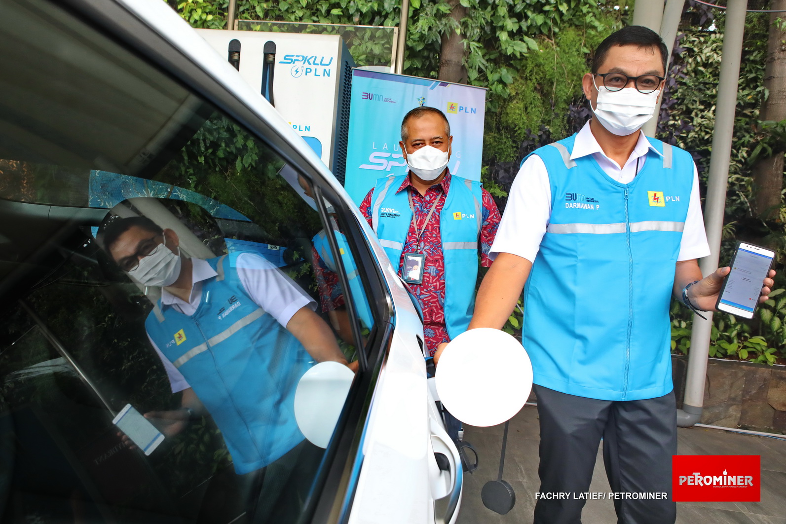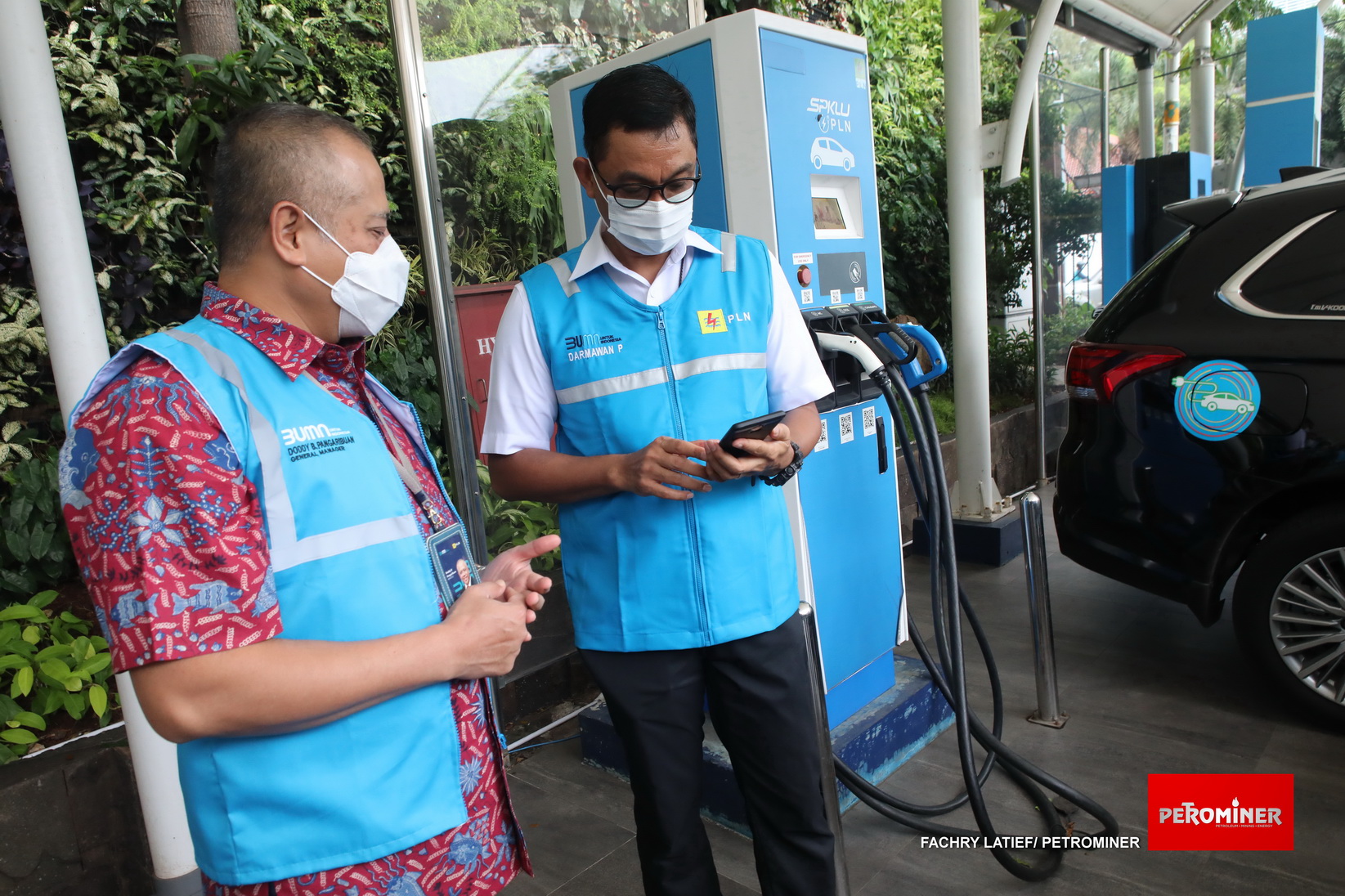 Wakil Direktur Utama PLN Darmawan Prasodjo (kanan) didampingi General Manager PLN Unit Induk Distribusi Jakarta Raya, Doddy B. Pangaribuan (kiri), saat melakukan pengisian daya mobil listrik dengan aplikasi PLN Charge.IN. (Fachry Latief/ Petrominer)