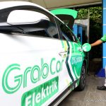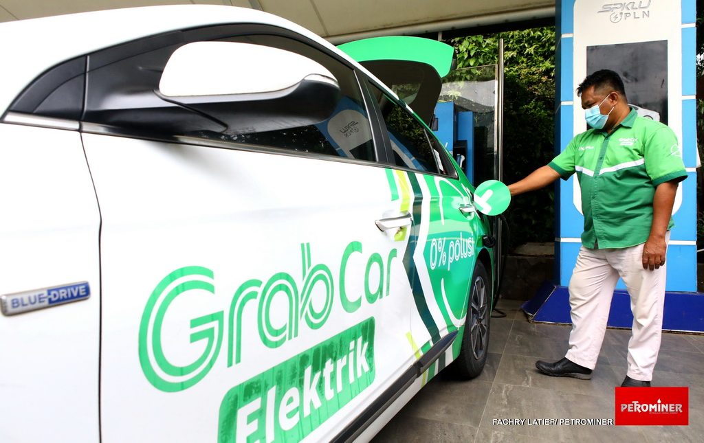 Seorang pengemudi taksi on line sedang mengisi daya mobil listrik dengan memanfaatkan aplikasi PLN Charge.IN di SPKLU PLN di Kantor PLN Disjaya, Jakarta, Jum’at (29/1). (Fachry Latief/ Petrominer)