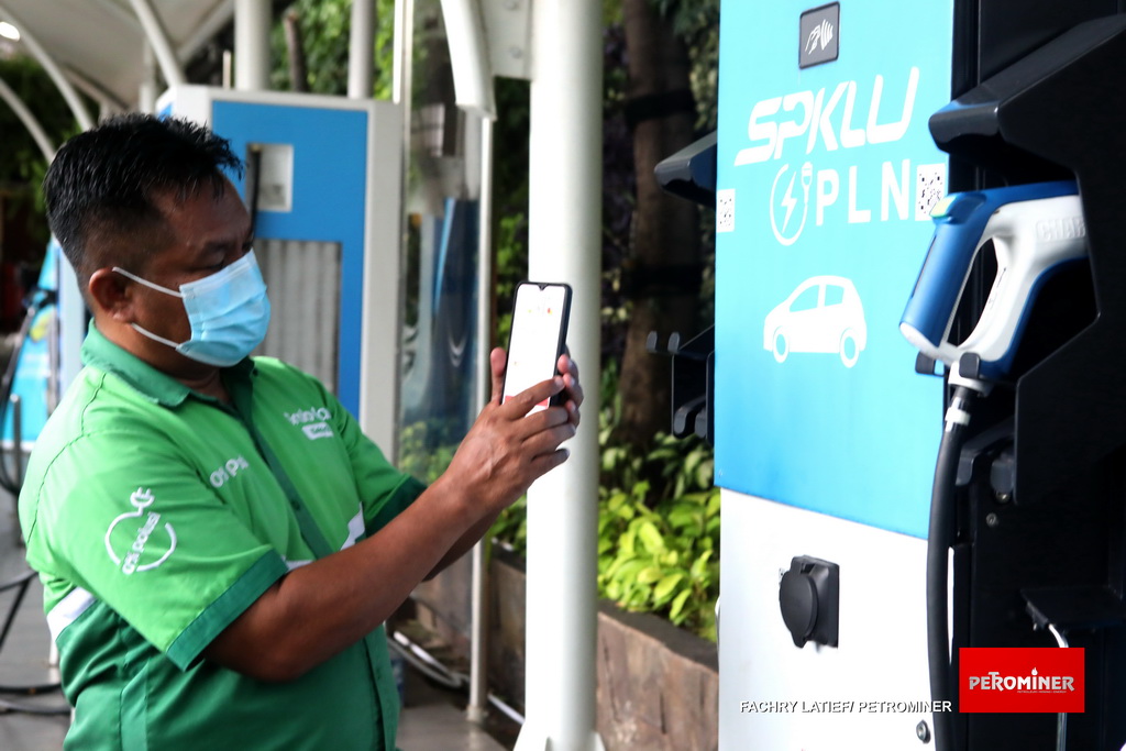 Seorang pengemudi taksi online sedang mengisi daya mobil listrik di SPKLU. (Fachry Latief/ Petrominer)