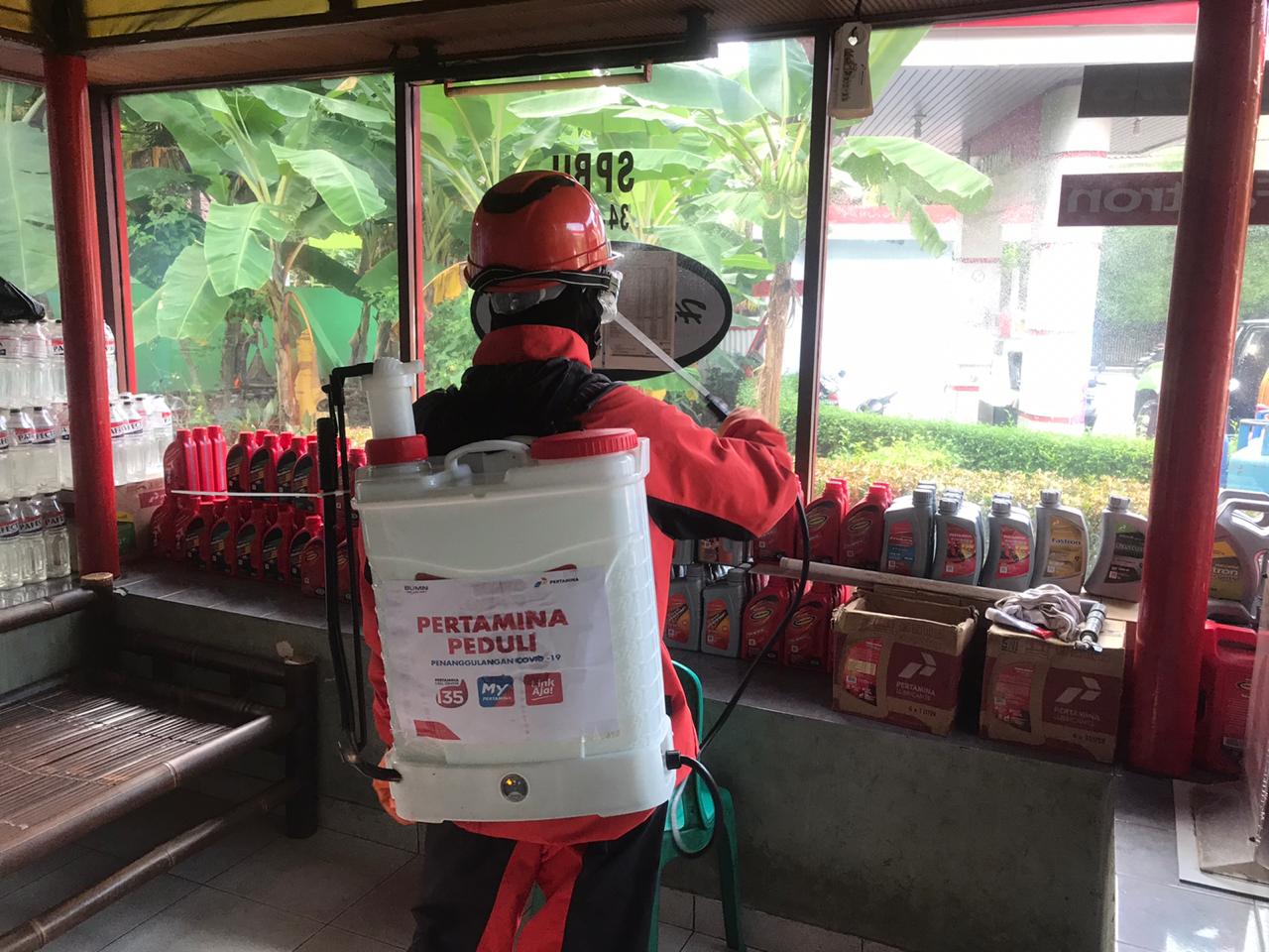 Penyemprotan disinfektan ke fasilitas SPBU.