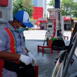 Selain sterilisasi fasilitas, para petugas SPBU yang melayani juga dibekali dengan masker dan sarung tangan.
