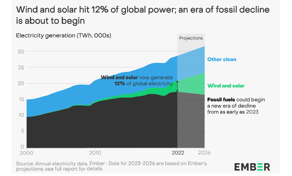 Laporan itu menunjukkan bahwa tahun lalu bisa jadi merupakan puncak emisi ketenagalistrikan dan tahun terakhir pertumbuhan listrik yang ditenagai bahan bakar fosil. Pada tahun 2023, energi bersih diperkirakan akan memenuhi semua peningkatan permintaan listrik. Dengan demikian, pembangkit listrik berbahan bakar fosil akan menurun sedikit (-0,3 persen) pada tahun 2023, dan terus menurun pada tahun-tahun berikutnya seiring meningkatnya tenaga angin dan surya.