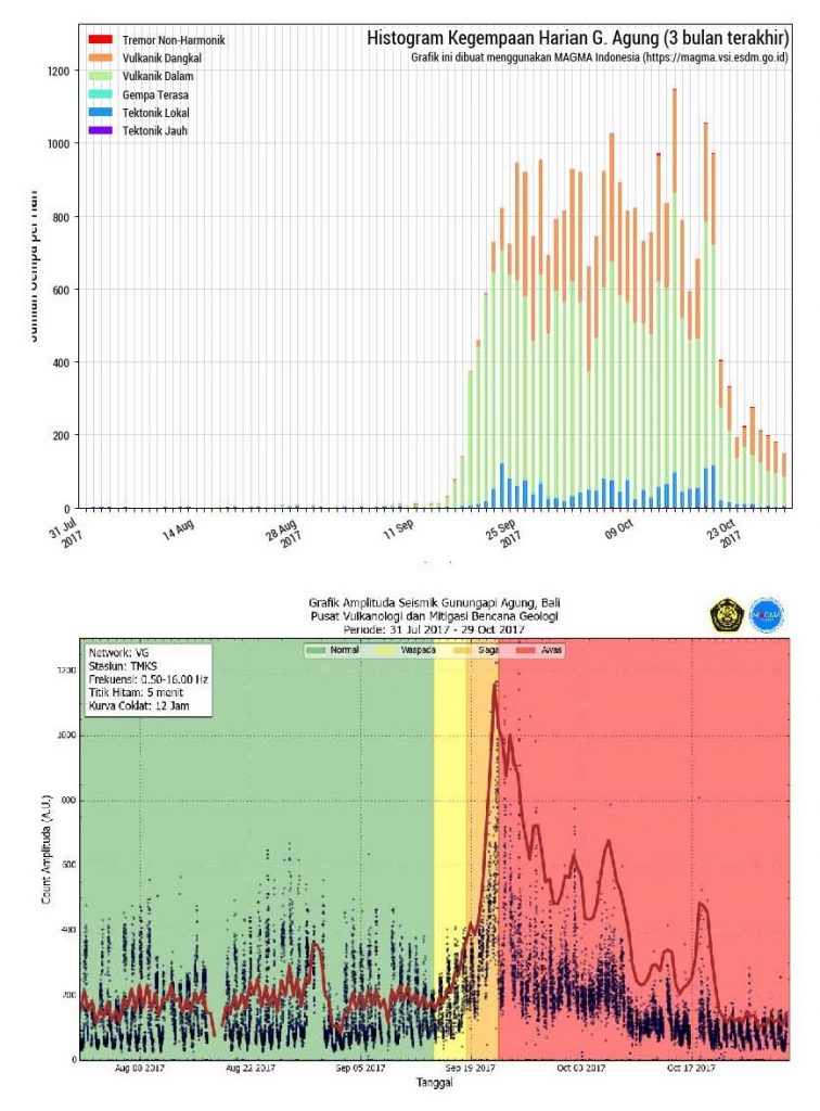 Penurunan status tersebut didasarkan atas data pengamatan visual dan instrumental G. Agung, Bali hingga 29 Oktober 2017 pukul 12.00 WITA, yang sebagai berikut: