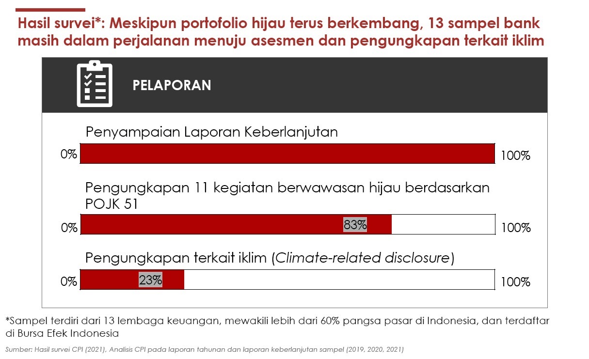 Associate Director CPI, Tiza Mafira, dari segi komitmen keuangan berkelanjutan (sustainable finance), temuan CPI Indonesia menunjukkan bahwa, walaupun terus bertumbuh, porsi yang dialokasikan sektor perbankan untuk pendanaan 11 kategori hijau hanya 27 persen. Sedangkan mayoritas (73 persen) diberikan untuk kegiatan sosial UMKM.