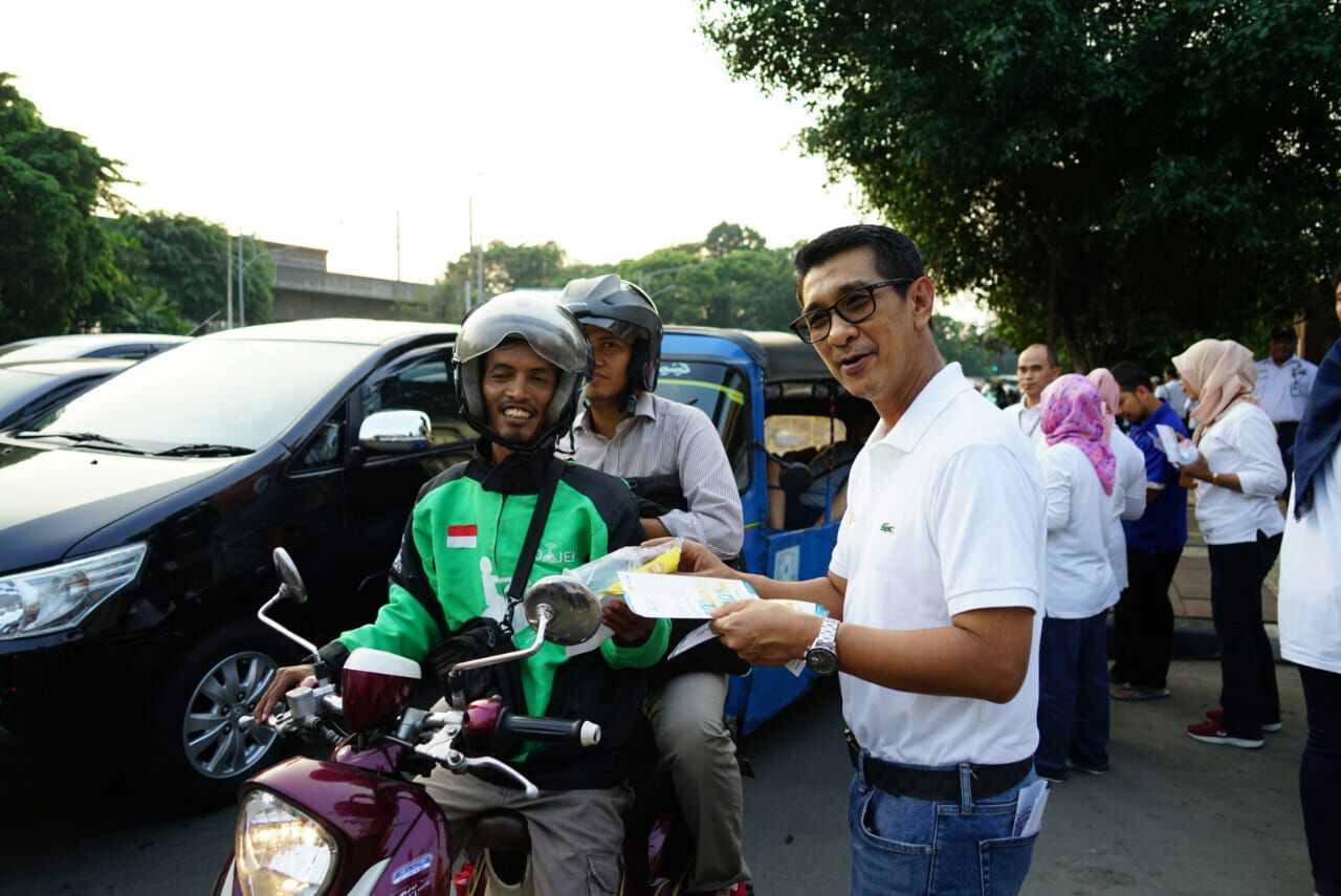 Setelah memimpin apel karyawan PLN Disjaya, Ikhsan bersama karyawan lainnya membagikan takjil kepada para pengendara yang melintas di tengah kemacetan di depan kantor PLN Disjaya di Jalan M.I. Ridwan Rais jelang waktu berbuka puasa.