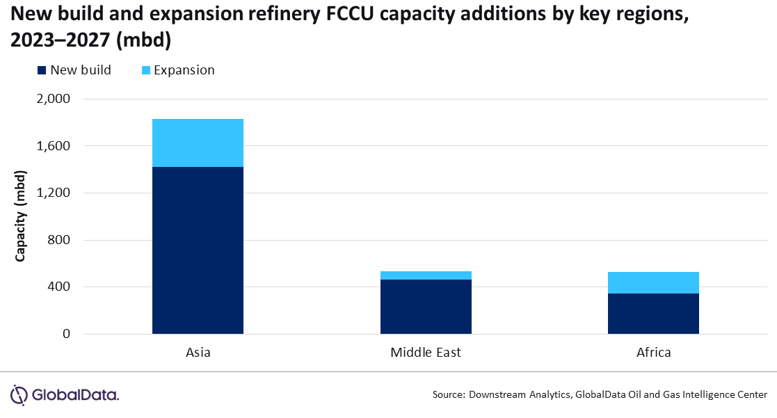 Dalam laporan terbaru bertitel “Refinery Fluid Catalytic Cracking Units (FCCU) Capacity and Capital Expenditure (CapEx) Forecast by Region and Countries Included Details of All Active Plants, Planned and Announced Projects, 2023-2027,” GlobalData mengungkapkan bahwa Asia diperkirakan akan menyaksikan total penambahan kapasitas FCCU sebesar 1.828 ribu barel per hari (bph) pada tahun 2027. Dari jumlah tersebut, 1.421 ribu bph kemungkinan berasal dari kilang yang baru dibangun, sedangkan sisanya dari perluasan kilang yang sudah ada.