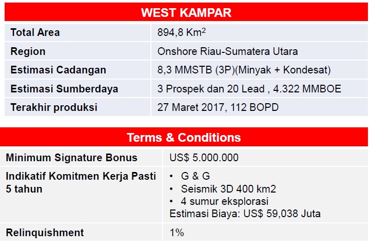 Jakarta, Petrominer – Pemerintah melelang wilayah kerja minyak dan gas (migas) Blok West Kampar yang telah berproduksi. Blok migas di daratan Riau ini baru saja dikembalikan oleh kontraktor atau operator sebelumnya karena tidak mampu lagi mengelolanya.