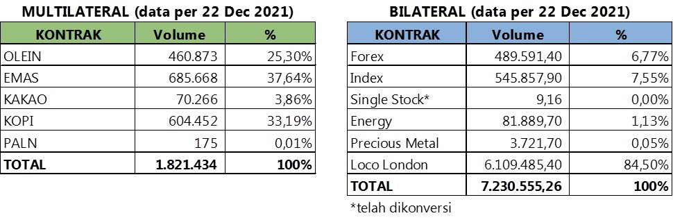 Kinerja perdagangan hingga 22 Desember 2021 untuk kontrak multilateral telah mencapai 1.821.434 lot atau 60,21 persen dari target. Namun, dibandingkan periode yang sama tahun 2020 yaitu 1.655.829 lot, maka volume transaksi multilateral tahun ini lebih tinggi 10 persen dari volume transaksi tahun lalu.