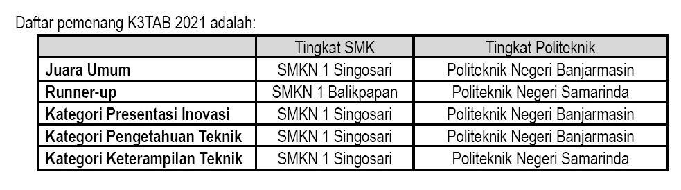 Kompetisi yang digelar pada pekan pertama dan kedua Oktober 2021 ini membawa SMKN 1 Singosari Malang dan Politeknik Negeri Banjarmasin menyandang gelar Juara Umum K3TAB 2021. Acara penutupan dan penyerahan hadiah dilakukan secara daring, Rabu (27/10).